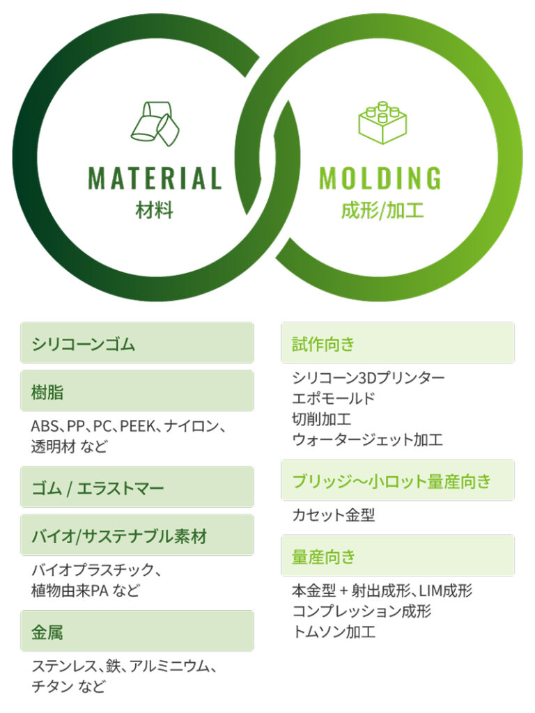 シリコーンゴムを含む各種の樹脂材料(汎用樹脂からスーパーエンプラ、バイオプラスチックまで)や金属・ゴム素材など幅広く対応しています。特にシリコーン材料に強みがあり、信越シリコーンの特約店として長年培ったノウハウを活かしています。